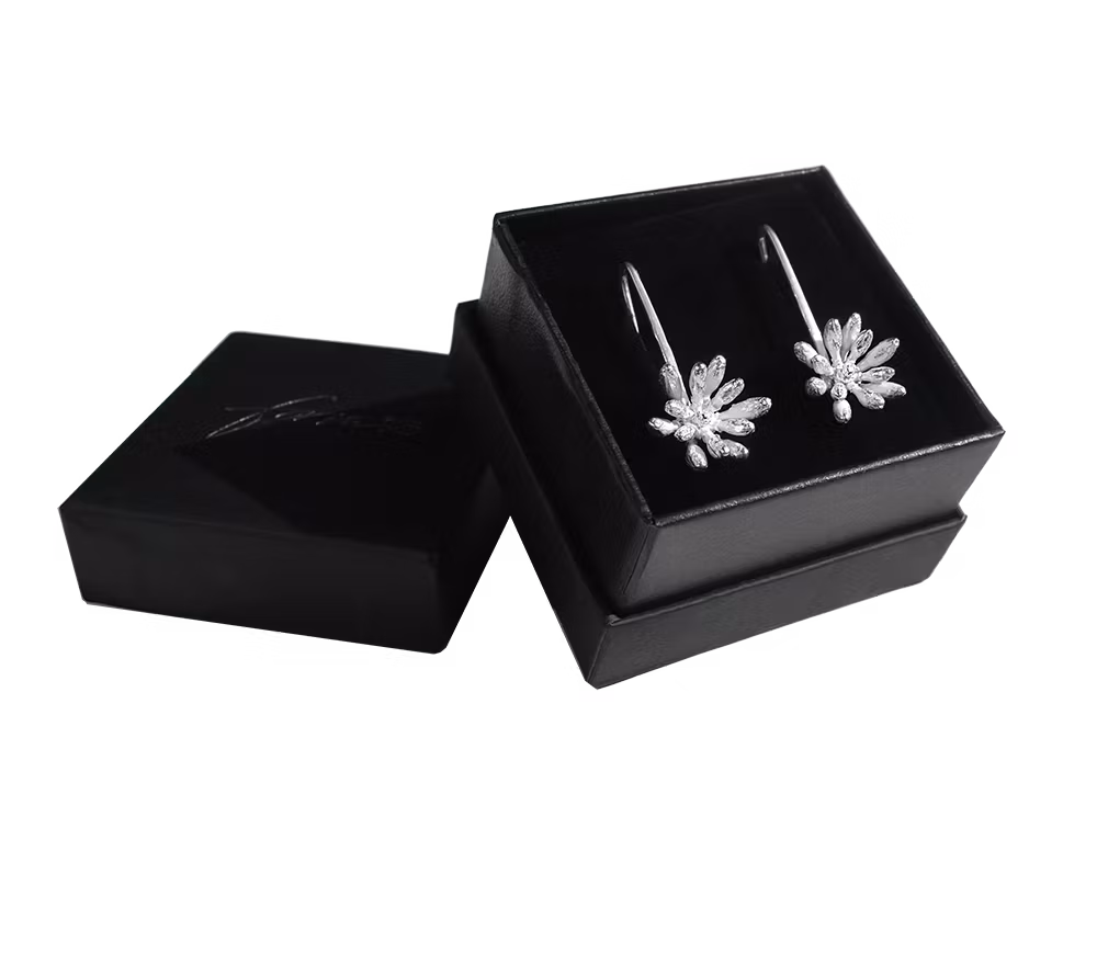 Earrings in 925 silver. Length approximately 19 mm, the flower about 12 mm in diameter. The perfection in the imperfect and the uniqueness of each flower is preserved in every piece of jewelry. Flower Power is a jewelry series where flowers have lent their form and strength to charms, necklaces, and earrings. Each piece of jewelry and each small flower is its own original. There is always only one of each, but sometimes several similar ones.