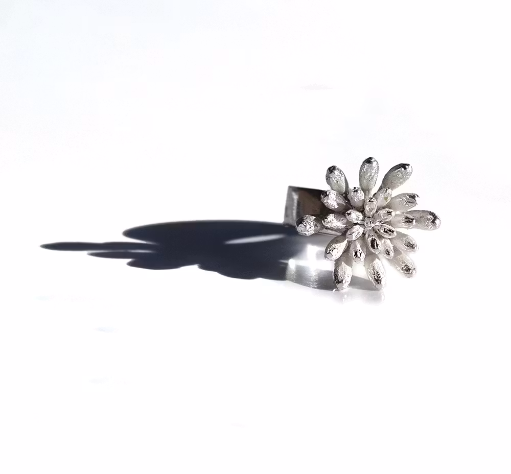 Silverring i 925 sterlingsilver. Blomma ca 17 mm i diameter höjd ca 9 mm. Ring storlek 52, ring diameter 16,5 mm, ring bredd 6 mm. Blomman är skapad efter en riktig blomma, bevarad och förevigade som de såg ut när jag plockade dem. Flower Power är en smycke-serie där blommor gett sin form och kraft till berlocker, halsband och örhängen. Det perfekta i det icke perfekta och unika i varje enskild blomma är bevarat i varje smycke. Varje smycke och varje liten blomma är sitt eget original och är en hyllning till det vackra i det förgängliga och finns bara i ett exemplar. Bär det som en påminnelse att allt förändras och att skönheten finns i detaljerna. Design och formgivning Marie-form925. Inspiration från den svenska naturen och tillverkade i Sverige